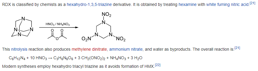 In this process, hexamine reacts with nitric acid, ammonium nitrate, glacial acetic acid, and acetic anhydride to form a crude product of RDX. This is then processed and purified to create usable RDX.
