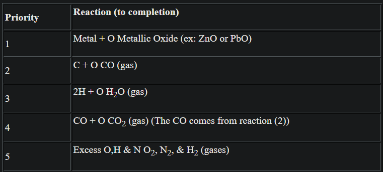 Most chemical explosions involve a limited set of simple reactions, all of which involve oxidation (reaction with oxygen). A relatively easy way to balance chemical explosive equations is to assume that the following partial reactions take place to their maximum extent (meaning one of the reactants is totally consumed) and in order of precedence: