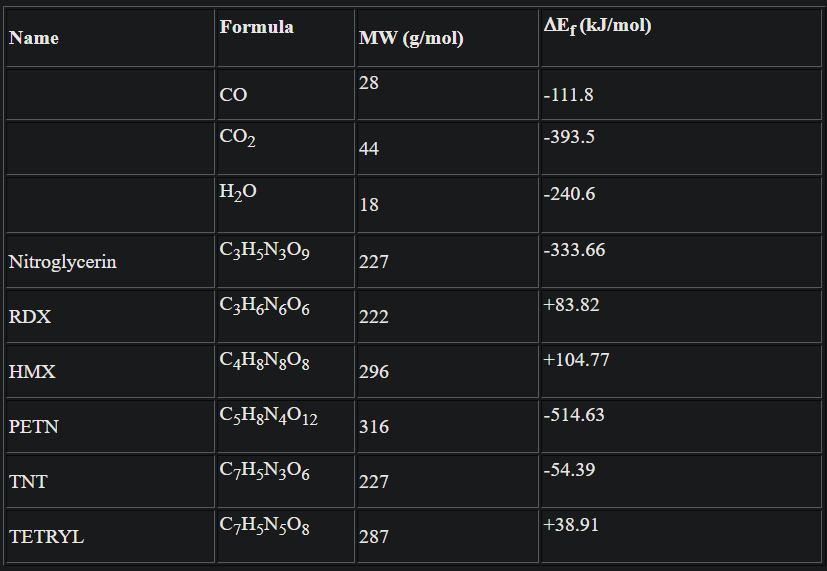 ∆E = ∆Ef(reactants) - ∆Ef(products)The heat of explosion is defined so that it will be positive for an exothermic reaction.