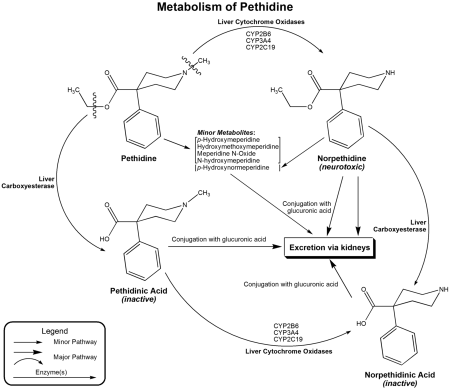 Meperidine is quickly hydrolysed in the liver to pethidinic acid and is also demethylated to norpethidine, which has half the analgesic activity of pethidine but a longer elimination half-life (8–12 hours). Accumulating with regular administration, or in kidney failure. Norpethidine is toxic and has convulsant and hallucinogenic effects.