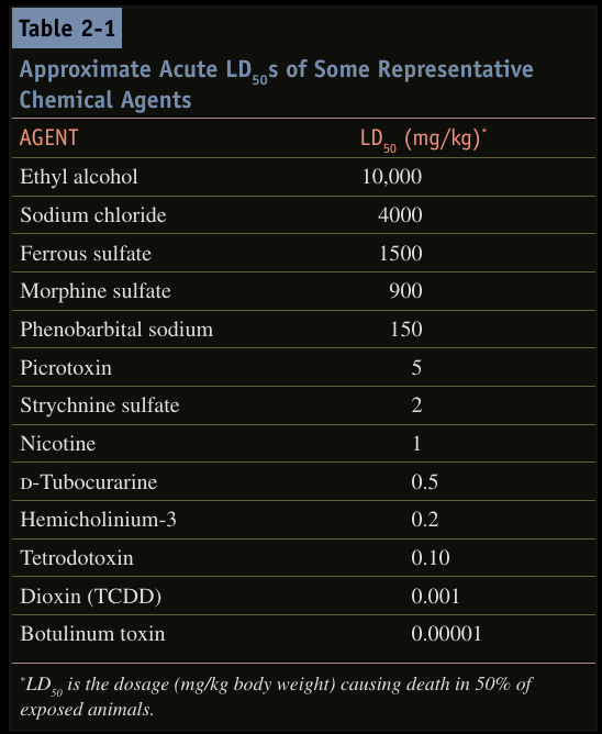 Among chemicals there is a wide spectrum of doses needed to produce deleterious effects, serious injury, or death. The median lethal dose, LD50 (abbreviation for “lethal dose, 50%”), LC50 (lethal concentration, 50%) or LCt50 is a measure of the lethal dose of a toxin, radiation, or pathogen.