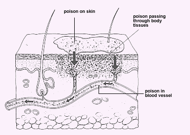 When absorbed through the skin the toxin passes first through the pores, then into the subcutaneous tissues and then finally into the blood stream.