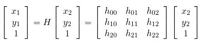 The homography is a 3x3 matrix that maps each point of the first image to the corresponding point of the second image. See below where H is the homography matrix being computed for point x1, y1 and x2, y2