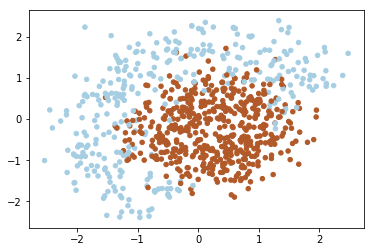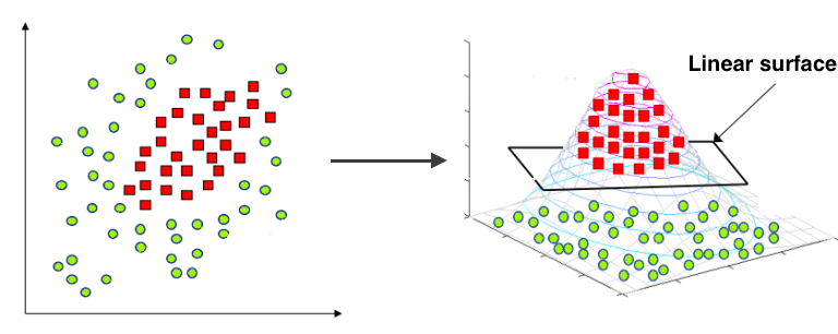 As you can notice the data above isn’t linearly separable. Since that we should add features (or use non-linear model). Note that decision line between two classes have form of circle, since that we can add quadratic features to make the problem linearly separable. The idea under this displayed on image below:
