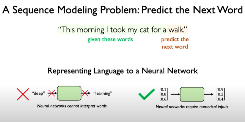 To make use of RNNs in a problem like predicting the next word, we need to represent inputs numerically.