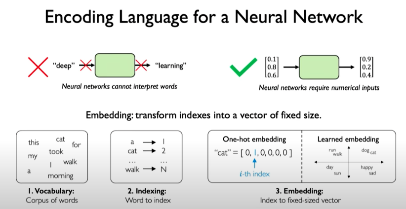 One way to encode language for a neural network is called embeddings. Embeddings can be represented as sparse vectors called one-hot embeddings or embeddings learned using a machine learning model that capture the semantic similarity of words and that meaning is represented in some latent way through the vectors.
