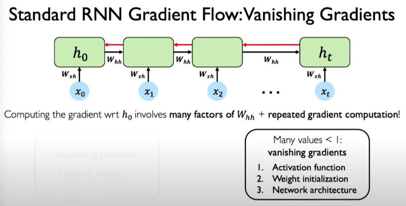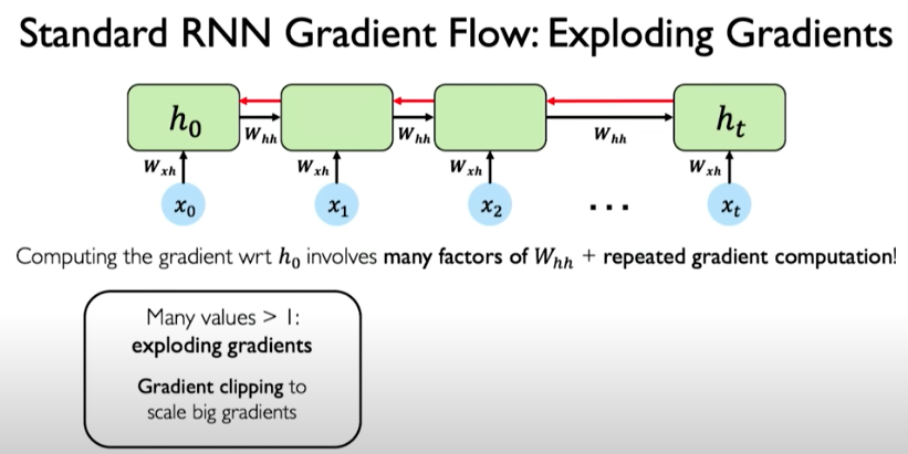 To compute the gradients it requires many matrix multiplications involving the weight matrix as well as repeated gradient computation. This repeated multiplication operation is problematic because gradients might explode during training in the situation where many values are much larger than 1.