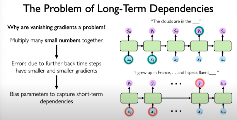 When we are multiplying many smaller numbers together, it could bias the model to potentially focus on short-term dependencies and effectively ignore the long-term dependencies.