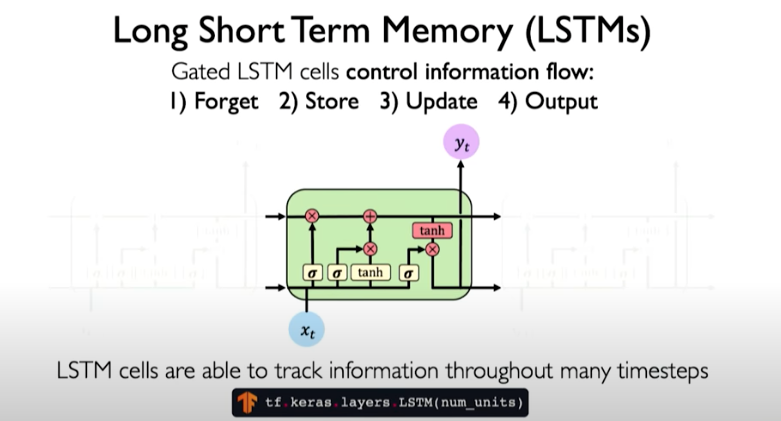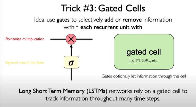 A more robust solution is to use a more complex recurrent unit to track more effectively the long-term dependencies. Gates help to selectively add or remove information within each recurrent unit. One example is called LSTM.