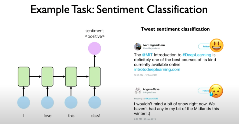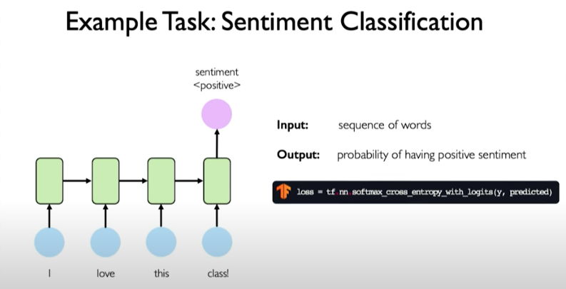 Another example task: sentiment classification where we are predicting a single output like the sentiment of a sentence.