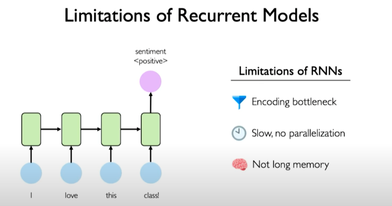 RNNs have an encoding bottleneck because we need to take a lot of content and condense it to a representation that can predicted on. Information can be lost in the encoding operation.