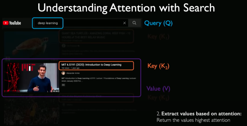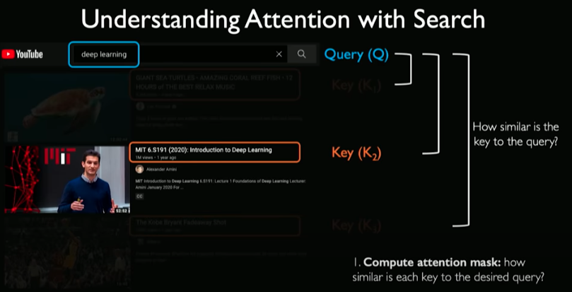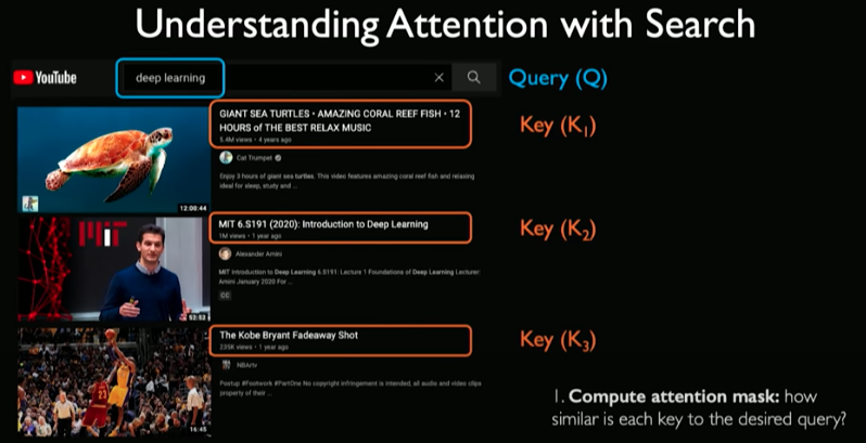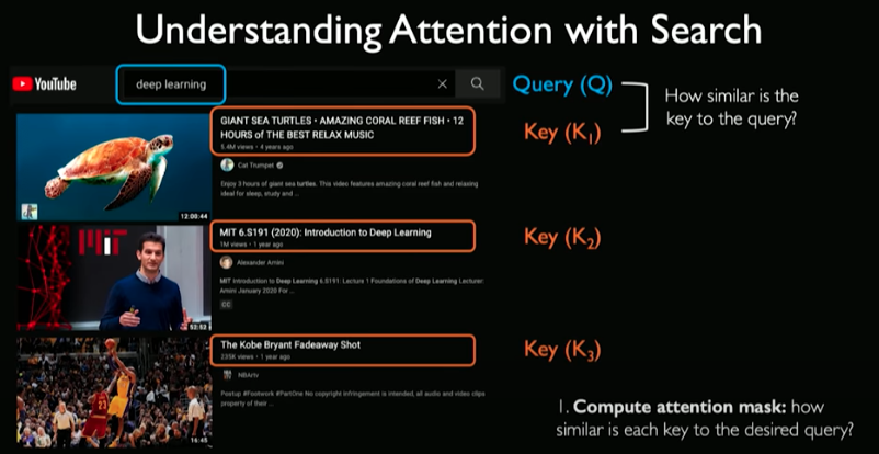 First we input a query. For every video in the database, some key information is extracted (e.g., title). To perform the search, you can compute the overlap between keys and queries. For every check, we ask how similar is that key to the query.