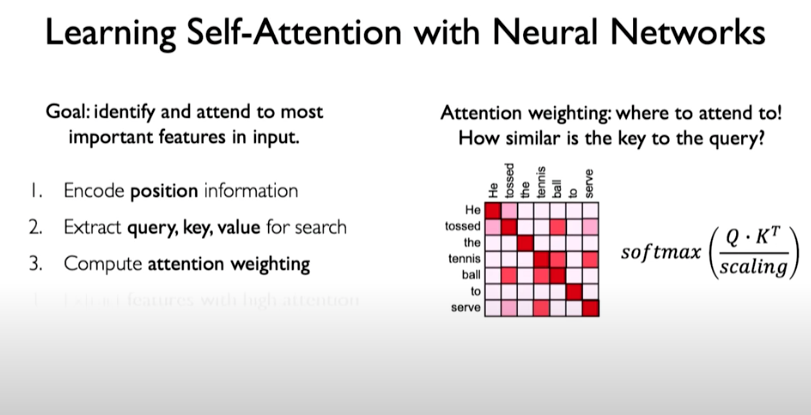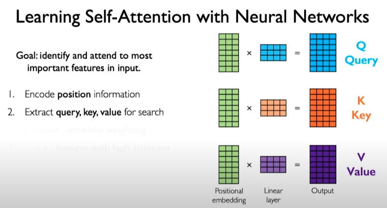 We then need a mechanism to identify and attend to the most important features in the input. Here we are doing self-attention meaning we are only operating on the input itself. To produce the query, key, and value representations, we can do the following:
