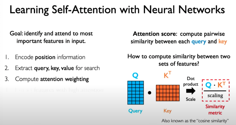 Then we take those three representations and compute the attention weighting. This can be done by computing pairwise similarity between each query and key, similar to the example we showed before related to the video search. We do this applying dot product operation which can then be applied to matrices.