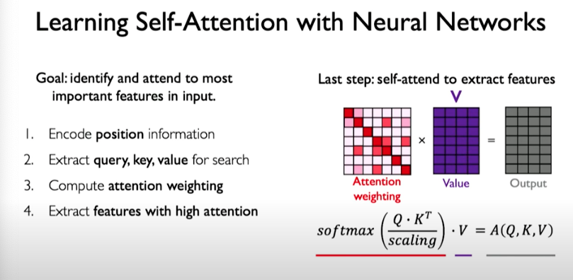 The final step is to use this matrix to extract features with high attention. We do this by taking attention weighting matrix and multiplying by value matrix to get a transformed version of the value matrix. The final output reflects the features that correspond to high attention.