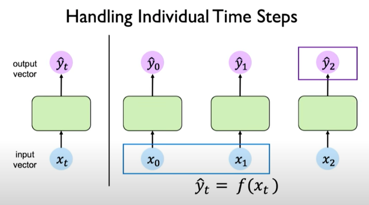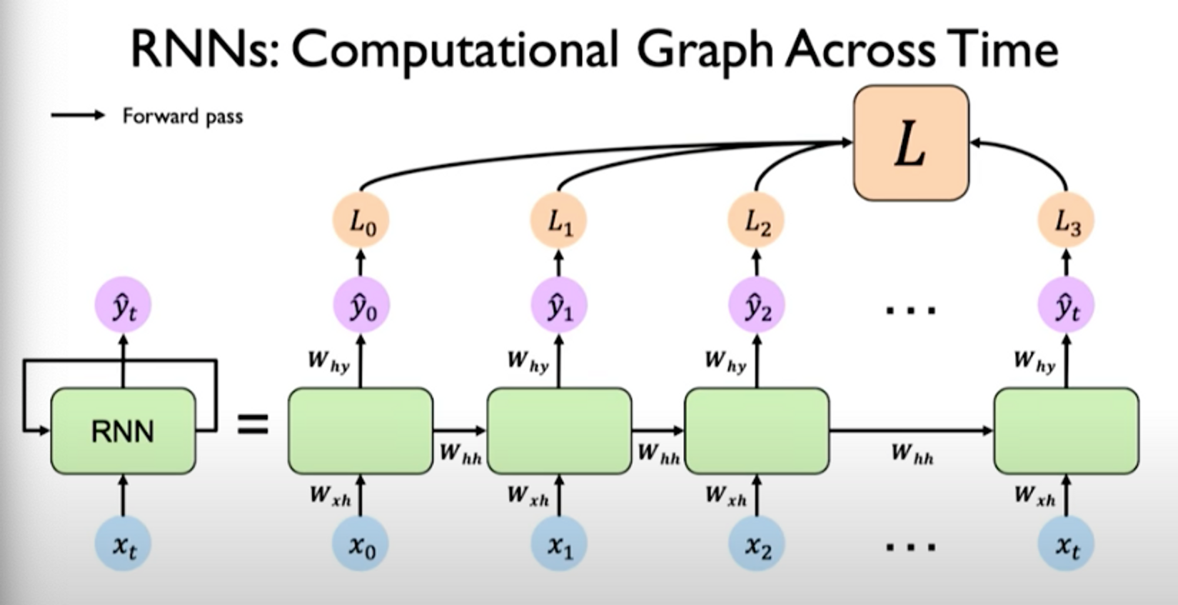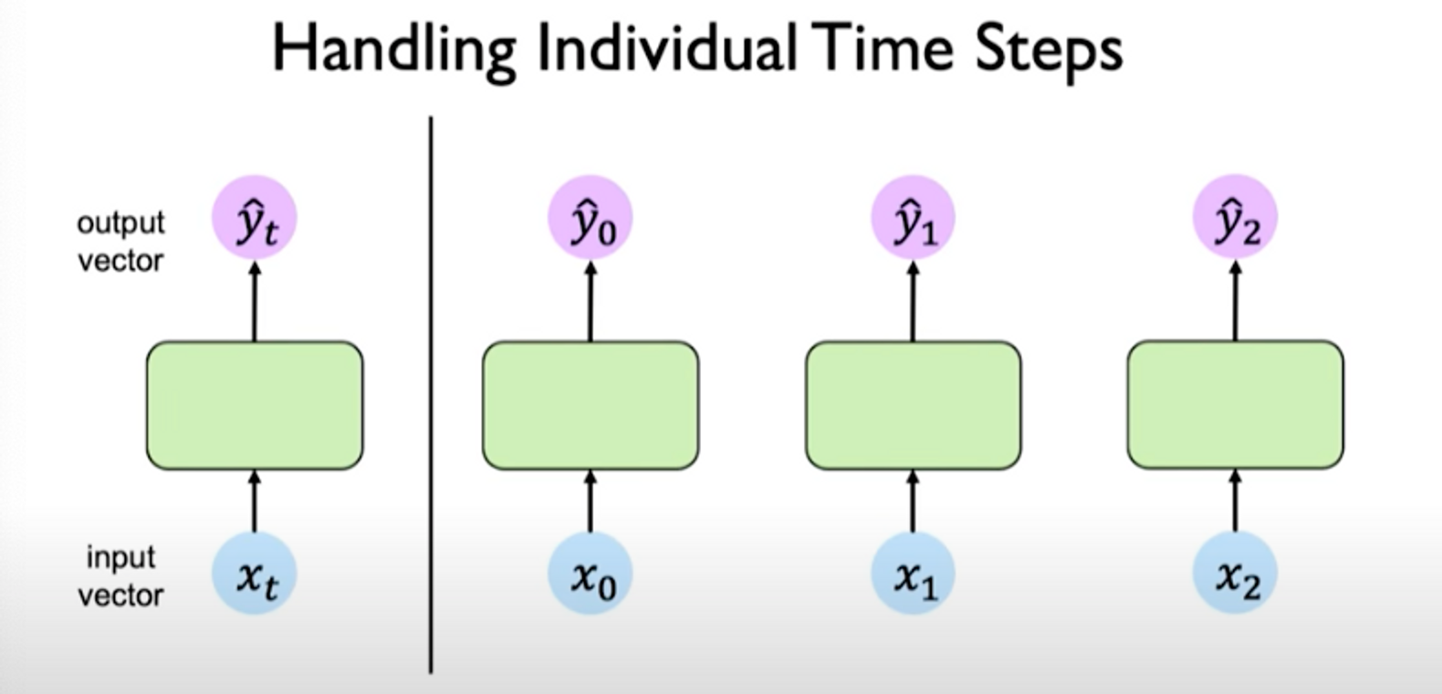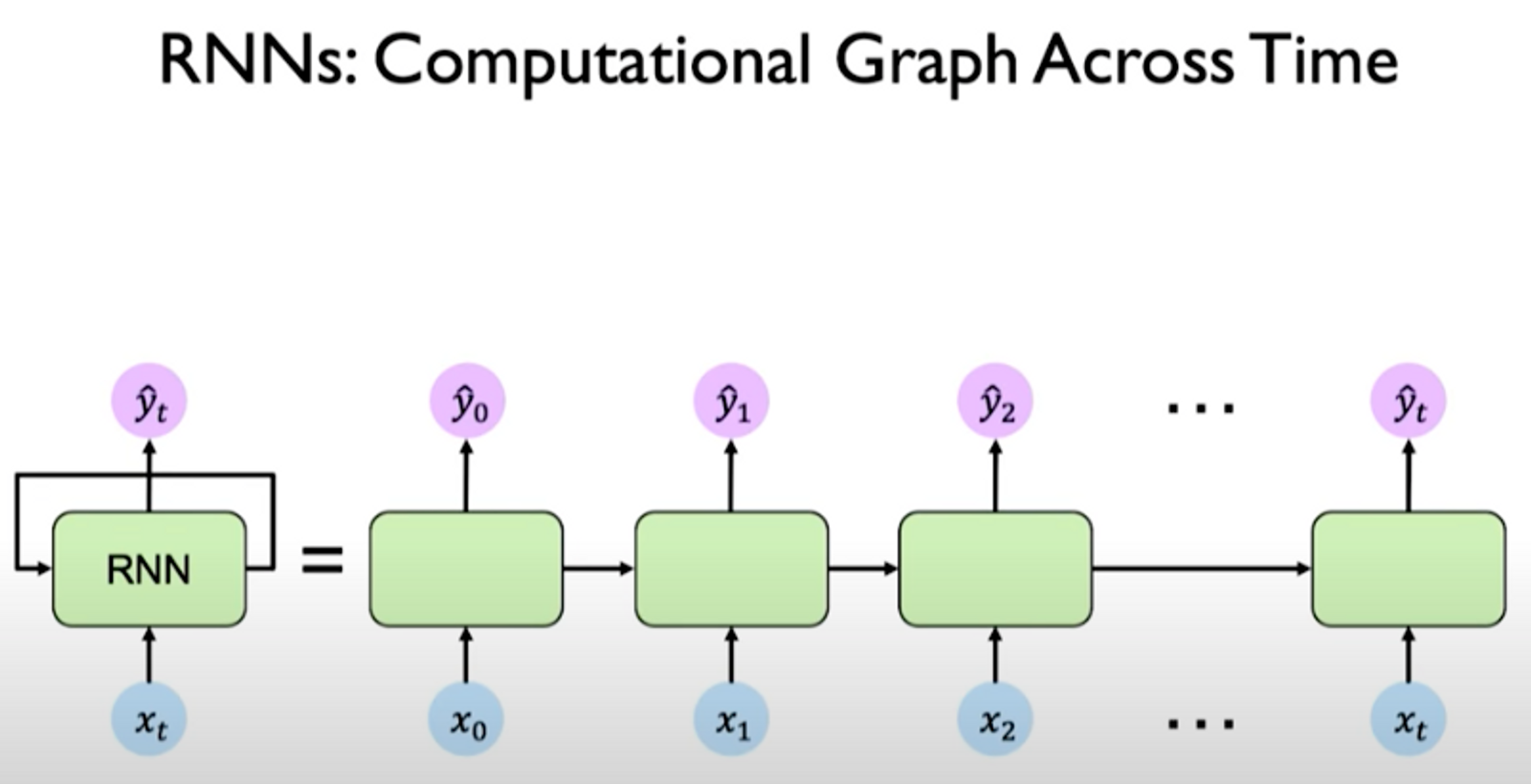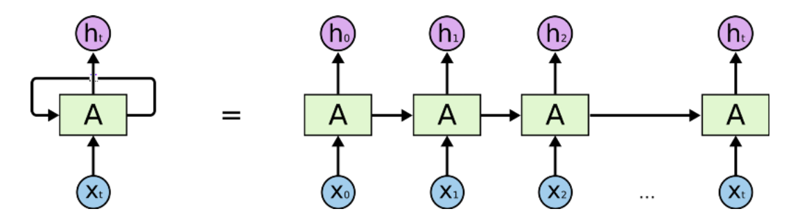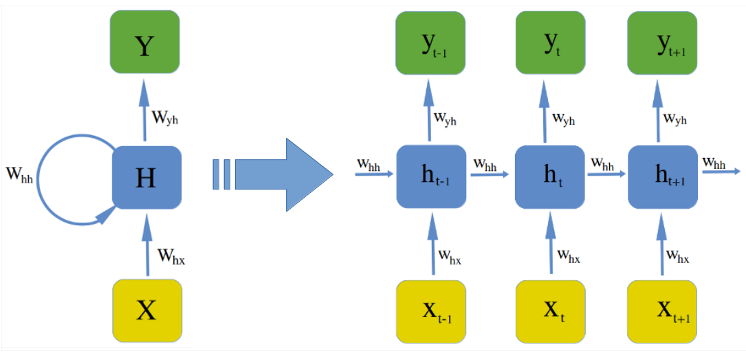 left: recurrence relationship depicted via cycle right: individual time steps operations being unrolled and extended across time
