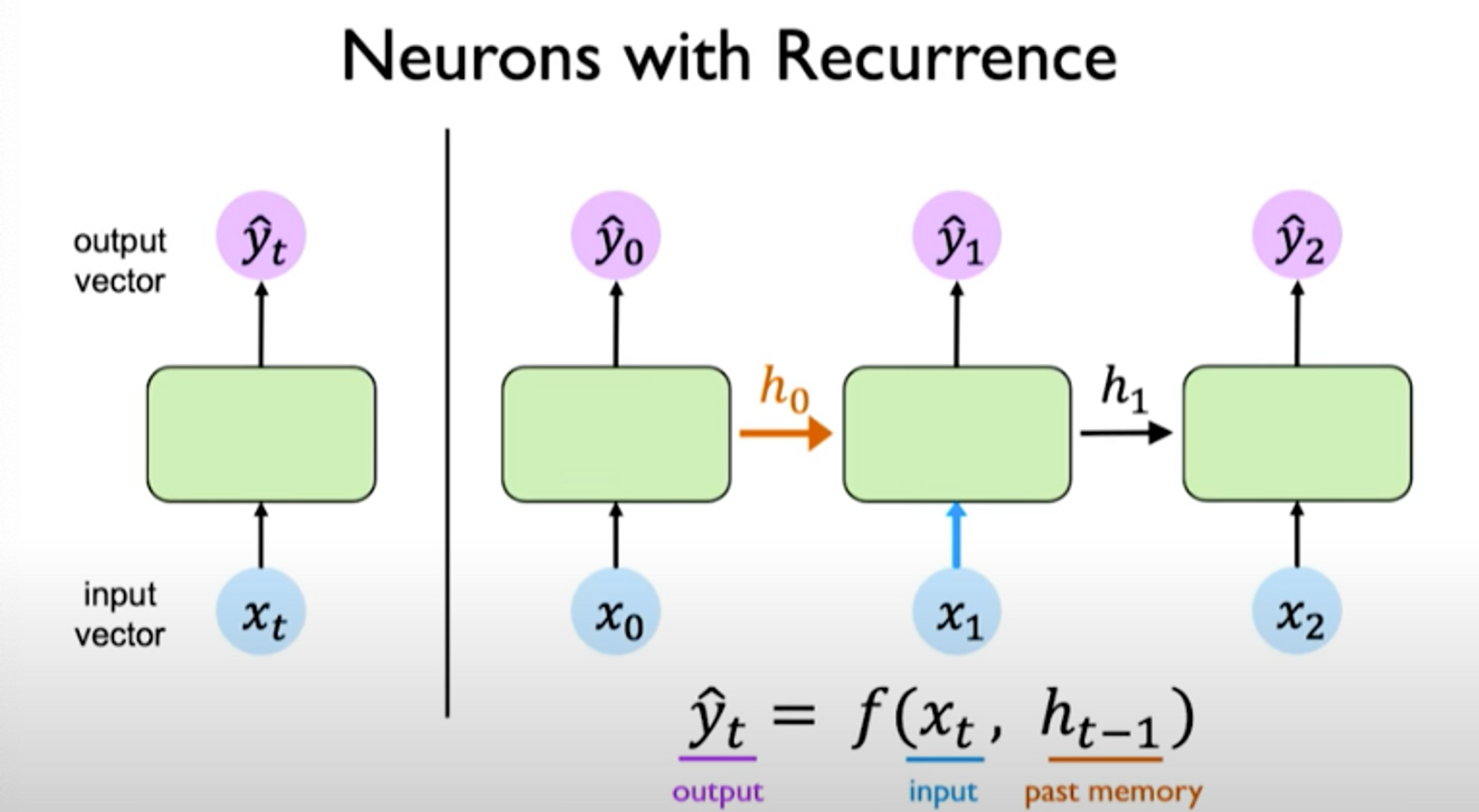 The output depends on the input as well as past memory. The past memory capture prior history of what has occurred previously in the sequence.