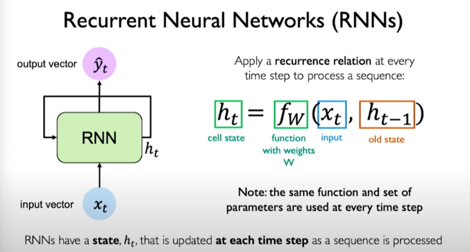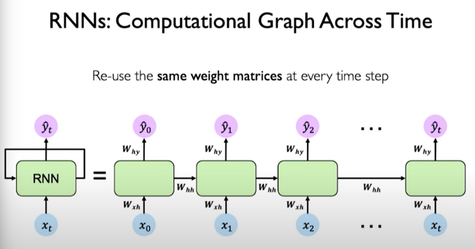 When we look at the exact components involved in the operations of an RNN, we notice that the same weight matrices are re-used at every time step.