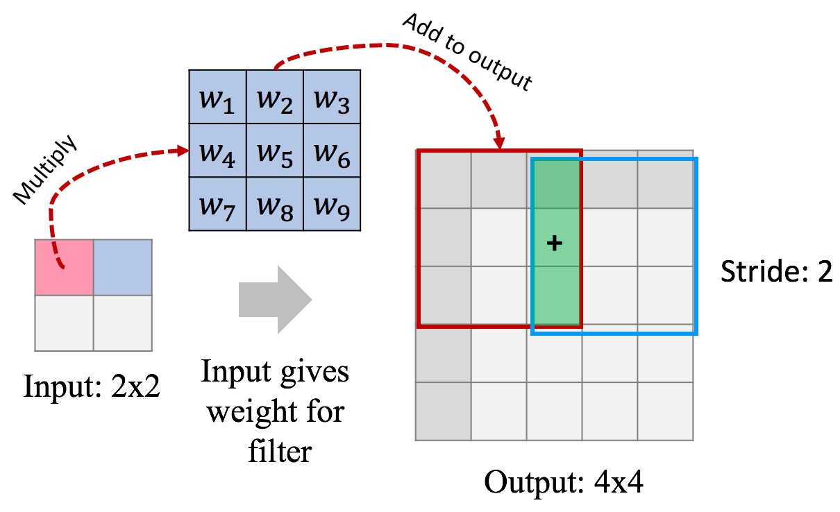 In this example we use a stride of 2 to produce 4x4 output, this way we “undo” pooling as well. Another way to think about it: we “undo” convolution with stride 2 (which is similar to conv + pool).