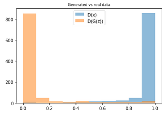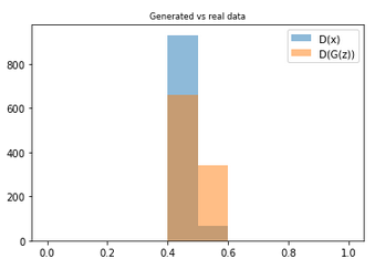 label='D(G(z))',alpha=0.5,range=[0,1])