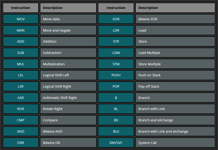 The ARM instruction set is a set of 32-bit instructions providing a comprehensive range of operations.