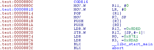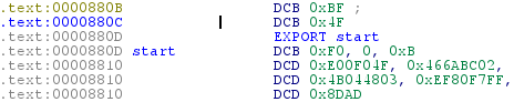 This is because start is located at the uneven address 0x880D. In other words the binary starts executing in Thumb mode at address 0x880C, but IDA thinks it starts executing at 0x880D. We fix this by selecting address 0x880C, pressing ALT+G, and changing the value to 1 (this tells IDA that Thumb code is located at this address). Now again select address 0x880C and press C to directly convert the section to code.