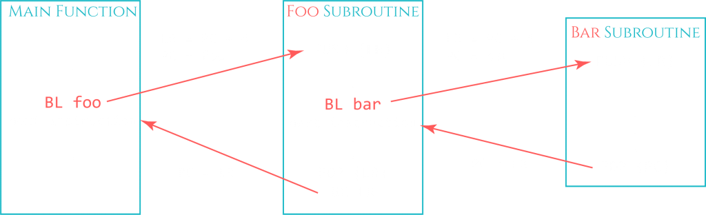 When a subroutine is being called, the return address is being preserved in the Link Register. This is done with a Branch with Link (BL) or Branch with Link and Exchange (BLX) instruction. But what if this subroutine calls another function? The Link Register would be overwritten and the program would not find its way back to the previous function. The way this is handled is by preserving the return address on the stack with a PUSH instruction. The PUSH instruction stores the register it is given (in this case LR: push {LR}) to the top of the stack before overwriting the register LR with the new return address.
