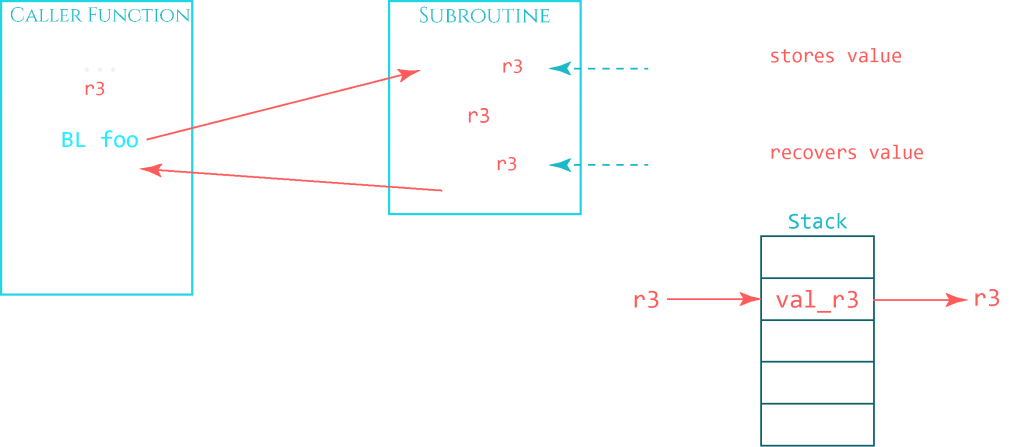 The same logic is used for registers that are being reused in a subroutine but need to keep track of the original value. In the next graphic you can see that the caller function uses register R3 as a counter, for example. The subroutine happens to require R3 for its own purposes and overwrites R3 with a different value and processes it in some way. To preserve the original value of R3, it gets pushed onto the stack at the beginning of the subroutine, changed and processed, and then restored to its original value by loading it from the top of the stack back to R3 with a POP instruction.
