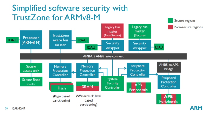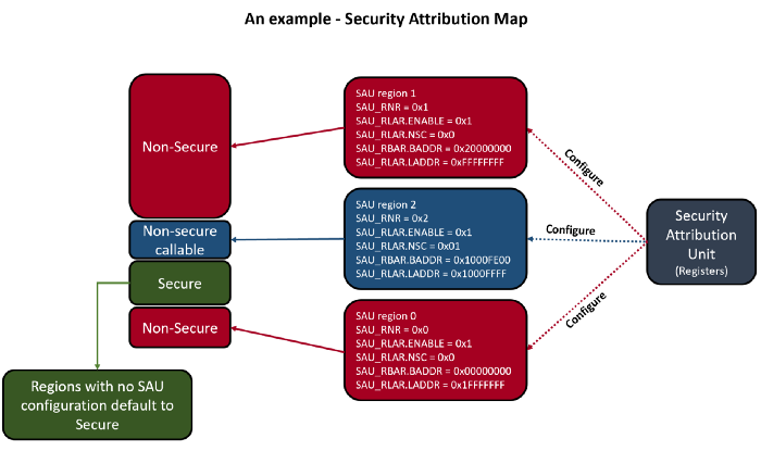 Systems that include the ARMv8-M Security Extension (known as TrustZone for ARMv8-M) provides a separate unit called the Secure Attribution Unit (SAU). This is similar to the MPU in that it can be used to configure different memory regions. However, the SAU focuses on security and allows system designers to create secure memory regions, which are more suitable for trusted secure software
