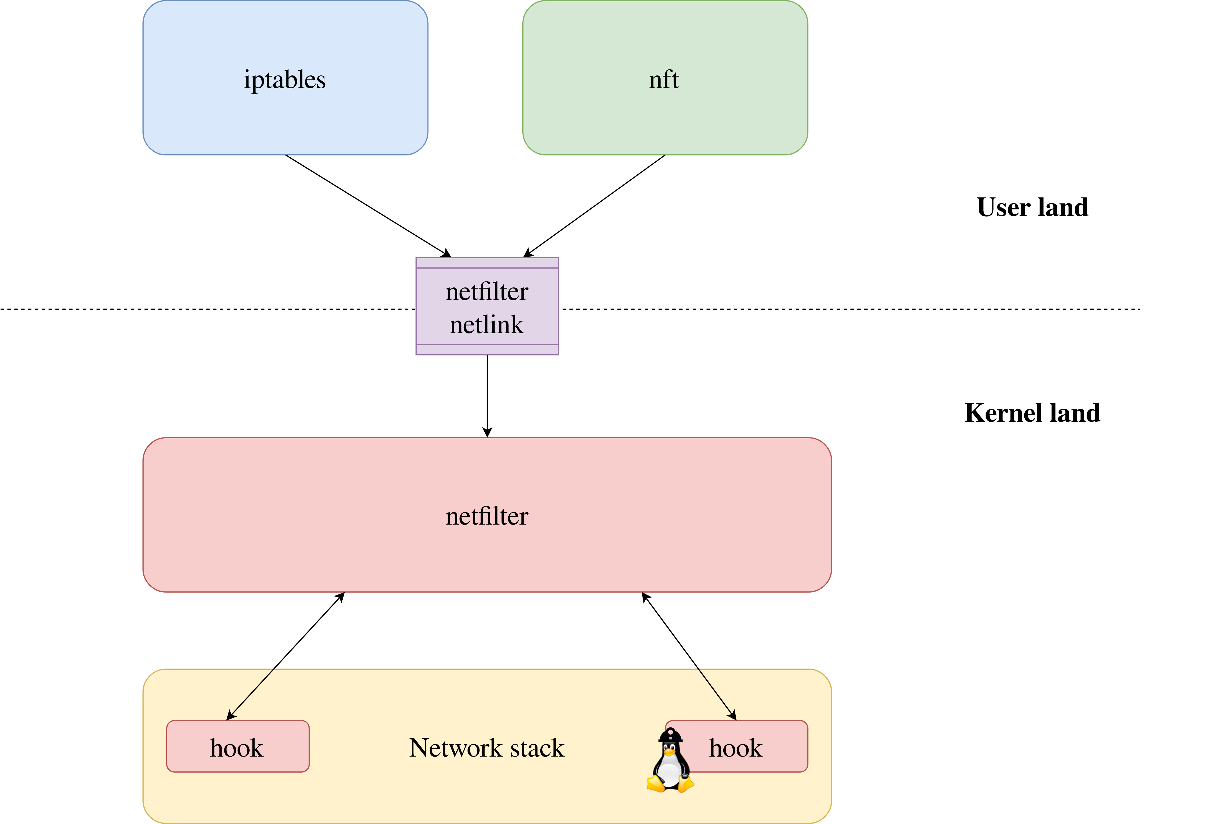 This project is often mentioned iptables which is the userland application used to configure your firewall. In 2014, a new subsystem was added to the netfilter firewall, called nftable, which is now configured through the nftables userland application.