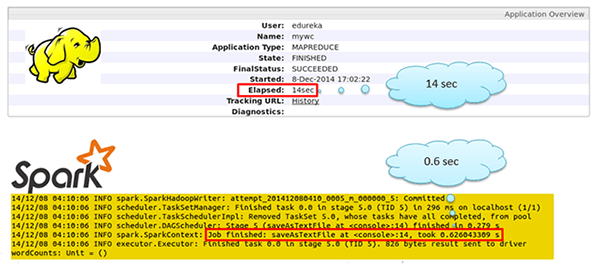 For the record, Spark is said to be 100 times faster than Hadoop. Oh yes, I said 100 times faster it is not a typo. The diagram below shows the comparison between MapReduce processing and processing using Spark