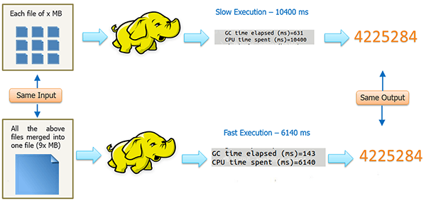 In this case, since all the small files (for example, Server daily logs ) is of the same format, structure and the processing to be done on them is same, we can merge all the small files into one big file and then finally run our MapReduce program on it.