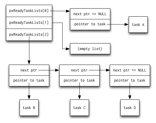 FreeRTOS uses a “ready list” to keep track of all tasks that are currently ready to run. It implements the ready list as an array of task lists like this: