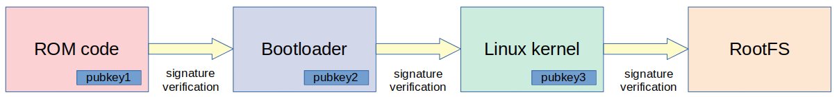 Everything starts in the ROM code inside the SoC. On NXP iMX6, there is a hardware component called High Assurance Boot (HAB) that it is able to validate the signature of the first stage bootloader, making it possible to implement a secure boot process. The High Assurance Boot inside iMX6 devices can also be called the Root of Trust, since if it is compromised, all the secure boot process is also compromised.