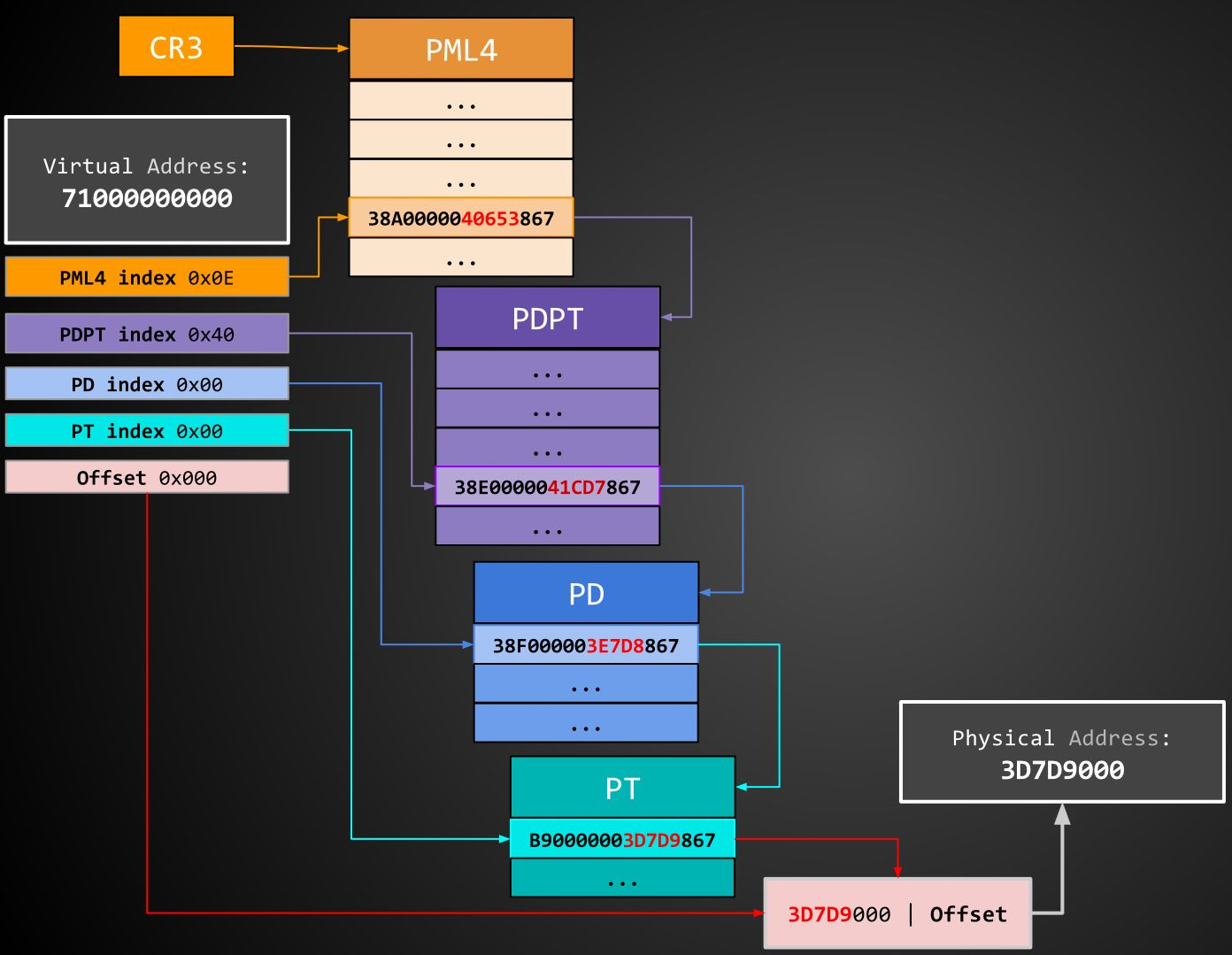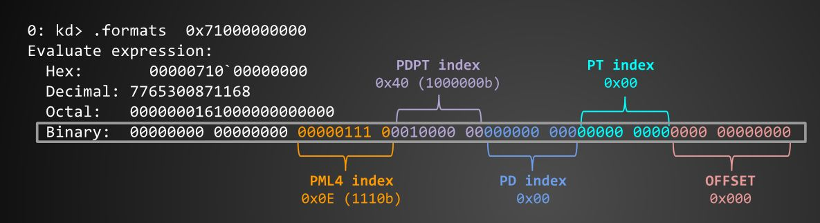 If we would like to walk the paging tables of (for example) virtual address 0x71000000000: