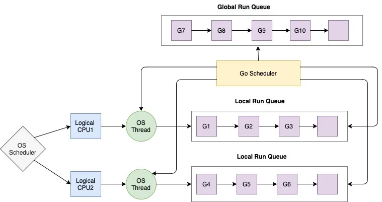 Now, the OS can schedule and manage threads, but it’s overhead to the OS, considering the properties that threads carry. That’s why the Go scheduler handles the goroutines, and it basically multiplexes the goroutines on the OS threads.