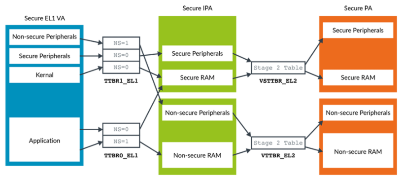 In Secure state, the stage 1 translation of a VM can output both Secure and Non-secure addresses. The NS bit in the translation table descriptors controls whether the Secure or the Non-secure address space is outputted. As shown in the following diagram, this means that there are two IPA spaces for stage 2, Secure and Non-secure: