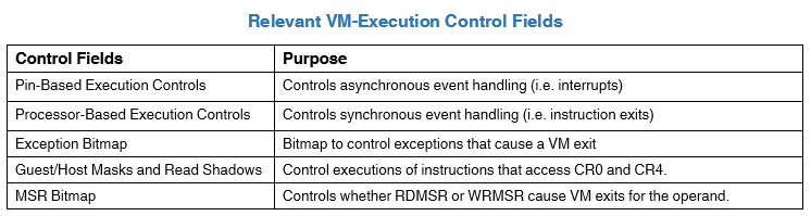 };- The next control field in the table is great for control of the hypervisor when it get to the launch phase. There are actually two 32-bit vectors that control the handling of synchronous events referred to as the