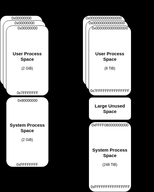 The first takeaway from this is that each process gets its own, private virtual address space, where the “kernel space” is kind of a “shared environment”, meaning each kernel process can read/write to virtual memory anywhere it wants to. Please note the latter is only true for environments without Virtualization-based Security (VBS), but that’s a different topic.