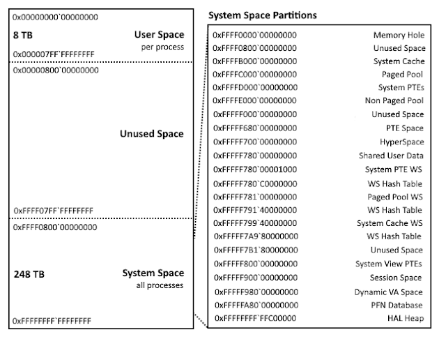 The virtual addresses for the kernel-mode regions may not be true on Windows 10, where these regions are subject to address space layout randomization (ASLR). Credits to Alex Ionescu for specific kernel space mappings.