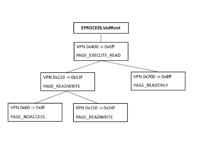 Each process has a VAD tree that can be located in the VadRoot member of the before mentioned EPROCESS structure. The tree is a balanced binary search tree (The tree itself is a self-balancing binarytree: at any given node, memory addresses lower than thosecontained at the current node can be found in the left subtreeand higher ranges in the right), with each node representing a region of virtual memory within the process.