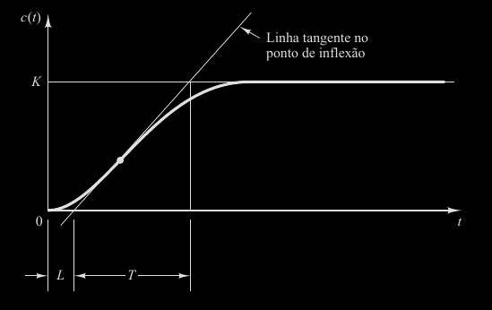 - O atraso e a constante de tempo são determinados desenhando-se uma linha tangente no ponto de inflexão da curva com o formato em S e determinando-se a intersecção da linha tangente com o eixo dos tempos e a linha c(t) = K (como mostra a Figura).