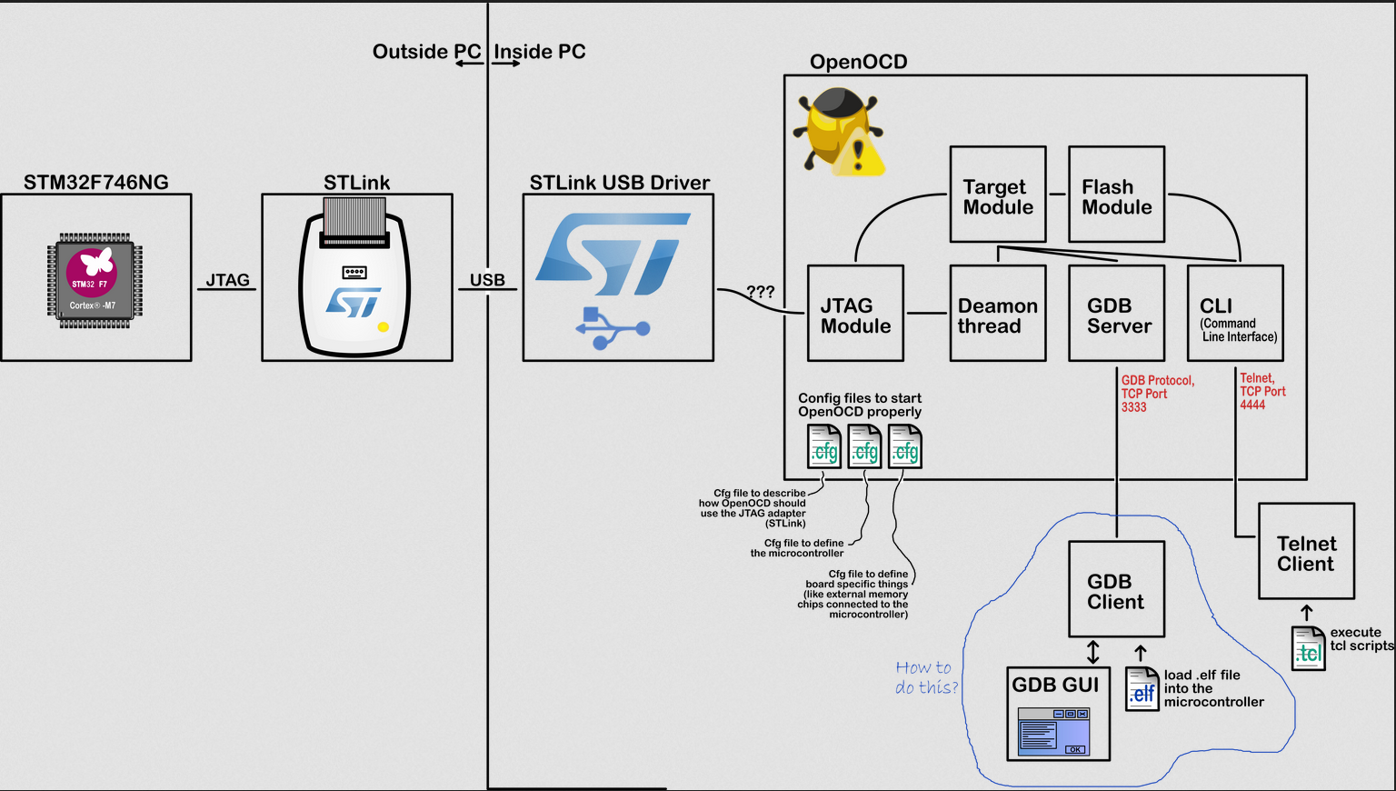 - Such commands could be sufficient for debugging your microcontroller, but many people were already familiar with the Gnu Debugger (GDB). This is why OpenOCD also starts a GDB server on TCP port 3333. A GDB client can connect to that port, and start debugging the microcontroller!