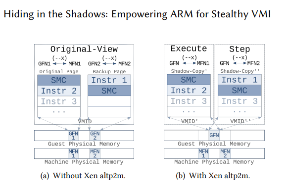 (…) while Intel as well as the AArch64 execution state of ARMv8 CPUs allow to hide memory-artifacts by marking memory pages as execute-only, second level translation tables of both the AArch32 execution state of ARMv8 and the ARMv7 architecture prohibit execute-only memory and thus impede stealthy VMI