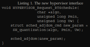 To use the SH-quantization algorithm, we introduce a new interface in order for Xen-ARM to directly use the algorithm. Listing ?? is the interface that enables Xen-ARM to support real-time scheduling. The interface is called from xeno-μC/OS-II since it has the information of its real-time tasks. The algorithm requires three input parameters from the guest OS, so the interface has three input parameters. Whenever the input parameters (Algo, Pmin, Uw) are changed, then the guest OS requests a new real- time scheduling for Xen-ARM. Then, Xen-ARM calculates the scheduling parameter for the guest OS through our algorithm. The SH_quantization() function returns with a feasible scheduling parameter (new_param) that includes the period (new_param.u.sedf.period) and execution slice (new_param.u.sedf.slice) from SH-quantization. Finally, the guest OS requests Xen-ARM to change the scheduling parameter via additional hypercall, sched_adjdom. Similarly to the other real-time schedulers, the scheduling parameter calculation can be done at offline, particularly when the real-time workload is usually fixed. Yet, online calculation has an advantage in cases when the workload changes over time. The algorithm is performed only when the task set is changed; thus, it would not be frequently invoked if the workload is not changed.