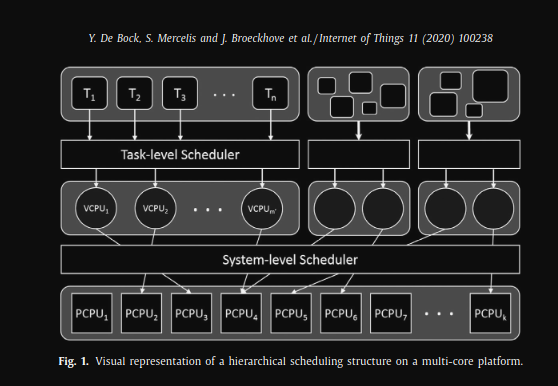 Virtualization introduces an hierarchical scheduling structure with two levels. In order to schedule real-time tasks, both levels must support real-time scheduling. The physical CPU (PCPU) of the hardware platform is presented to the VMs as a VCPU. These VCPUs are scheduled by the hypervisor to be executed on the PCPUs. Each VM operating system includes a task scheduler that schedules the real-time workload on the VCPUs. (…)