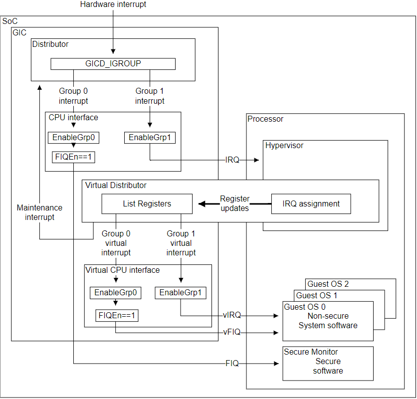 VM accesses to the GIC system registers are routed to a set of virtual system registers, which control virtual interrupt delivery. During a virtual CPU context switch, the hypervisor must save the writable virtual system register state, the state of any pending virtual interrupts, and the VM specific virtual interrupt configuration.