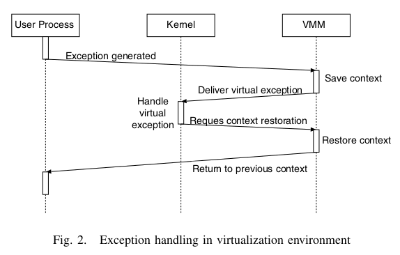 Xen invokes upcall to deliver exceptions to kernel mode as virtual exception events. On upcall, Xen puts the VSPSR information on the kernel’s stack so that kernel can get last running virtual processor mode. The upcall mechanism corresponds to hardware level exception handling that makes CPU to jump into exception vector table.