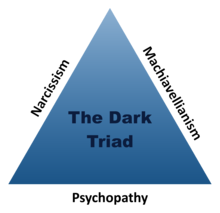 In psychology, the dark triad comprises the personality traits of narcissism, Machiavellianism, and psychopathy. They are called dark because of their malevolent qualities.