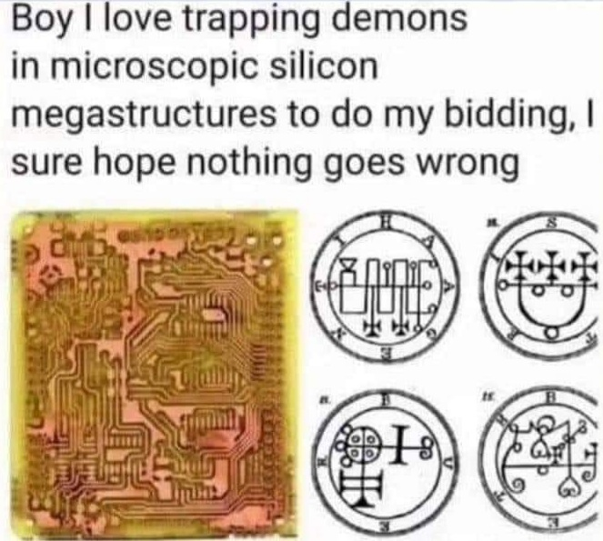 Once more, into stone, we inscribe glyphs, runes of power, which then conduct electrical current in complex operations to perform “logic”. We make computers out of crystals and light… Trapping demons in silicon crystal megastructures, forcing them to do our bidding.